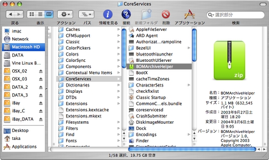 Finderでの zipの作業を受け持つのは/System/Library/CoreServices/BOMArchiveHelper.appです。