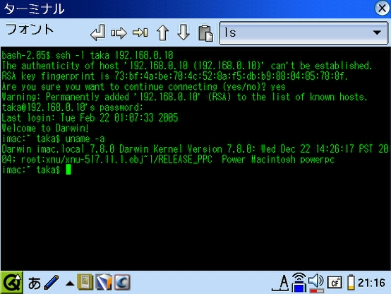 Linux ZaurusからSSHでMac OS X(その他unix系のOS)にアクセスする。