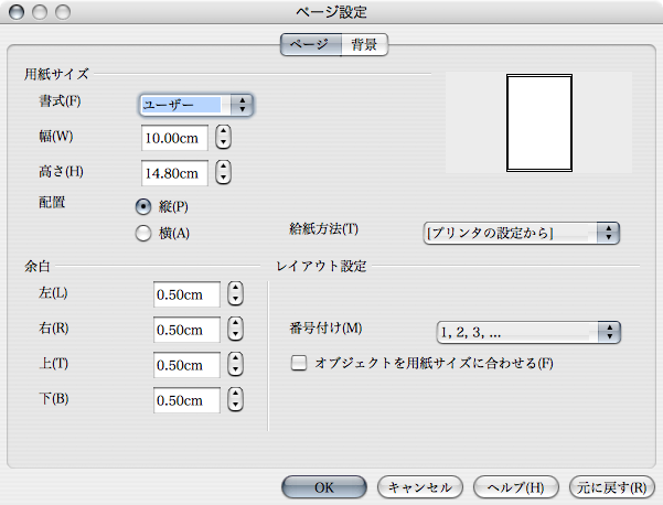 「書式」→「ページ」→「幅=10cm」「高さ=14.8cm」
