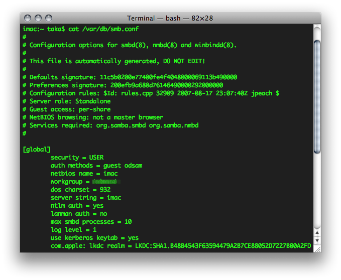 で/var/db/smb.conf を見るとworkgroup名がSambaを再起動することなく「WORKGROUP」から動的に任意のものに変更されました。