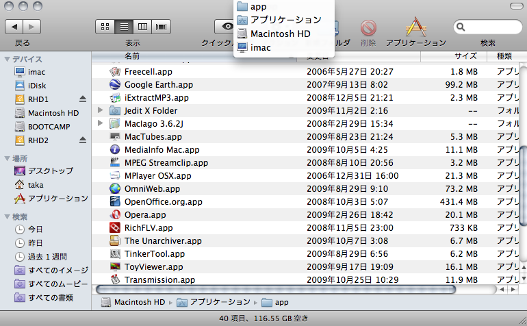 コマンドキー+Finderのタイトル部分をクリックすると上位フォルダの階層が表示されます。