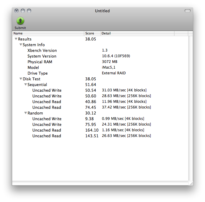 お約束のベンチマークですが、Firewire400での速度は以下の通りで思ったより遅いです。(RAID1で運用)玄人志向GW3.5MX2-SIU/CBよりも遅かったです。