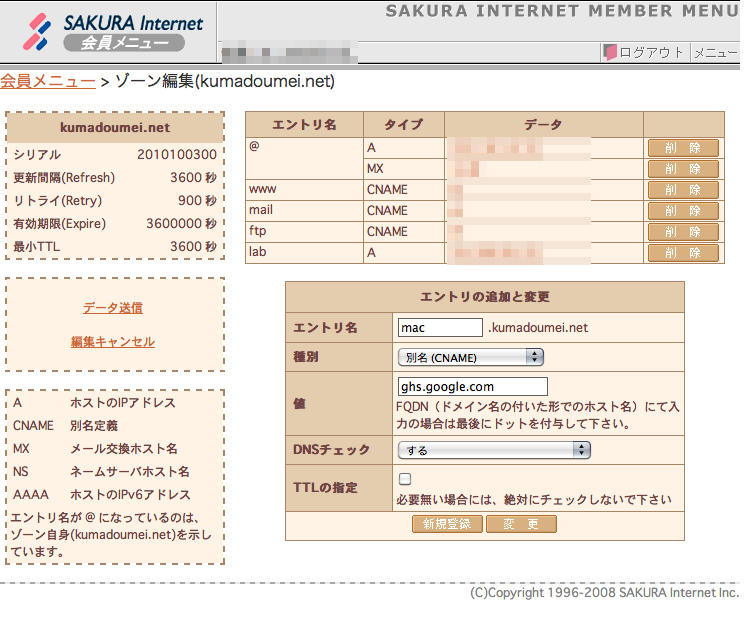 さくらインターネットの場合、「会員メニュー」→「ドメインメニュー」→「ゾーン設定」で行ないます。(ここではサブドメイン名をmacにしています)