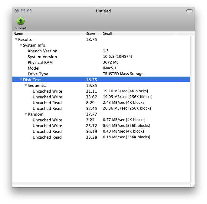 XBench.appで読み書きの速度を測ってみると、かなり遅かったです。私が所有しているのはiMac late 2006のため、FireWire800からFireWire400へ変換しているので最新のMacではもっと速いと思いますが・・・。また、Droboの採用する「BeyondRAID」はどうやらソフト的にRAIDを行っているようなので、その辺も影響しているのかもしれません。