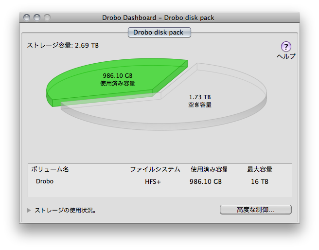 MacからDroboをアンマウントをする場合、マニュアルには「メニューバー」→「DroboDashboard」→「高度な制御−ツール」の「スタンバイ」ボタンをクリックします。さらに、