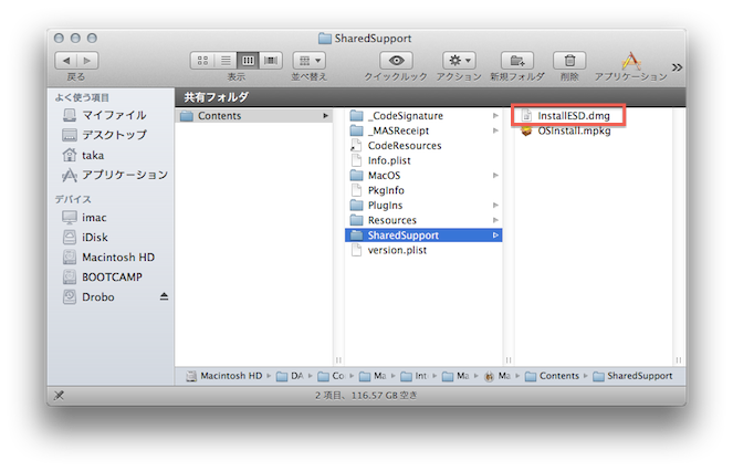 「Mac OS X Lion インストール.app」を右クリックし「パッケージの内容を表示」>「Contents」>「SharedSupport」の「InstallESD.dmg」をディスクユーティリティ.appを使用してDVDへ焼きます。