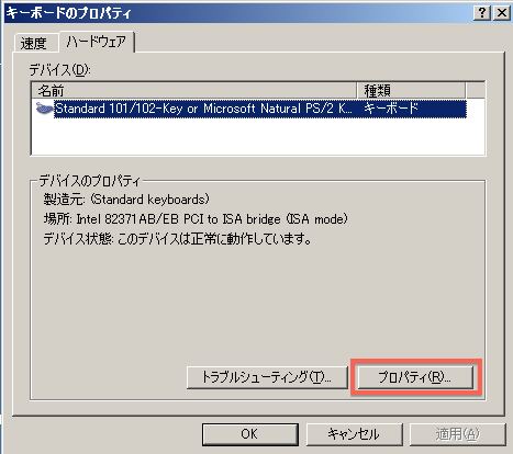 「Standard 101/102-Key or Microsoft Natural PS/2 Keyboard」になっているのを確認し「プロパティ」を選びます。