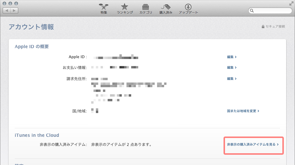 「アカウント情報」>「iTunes in the Cloud」>「非表示の購入済みアイテムを見る」をクリックします。