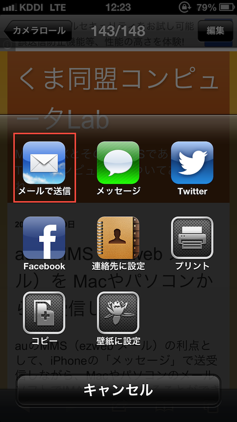 「カメラロール」から画像を選択し、連絡先とFacebookを統合しているユーザーへメールを送ろうとすると