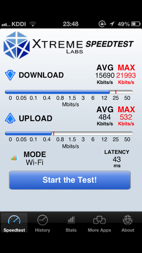 速度を計測するとダウンロードが平均15.7Mbps。Wi-Fiにしてはまずまずです。