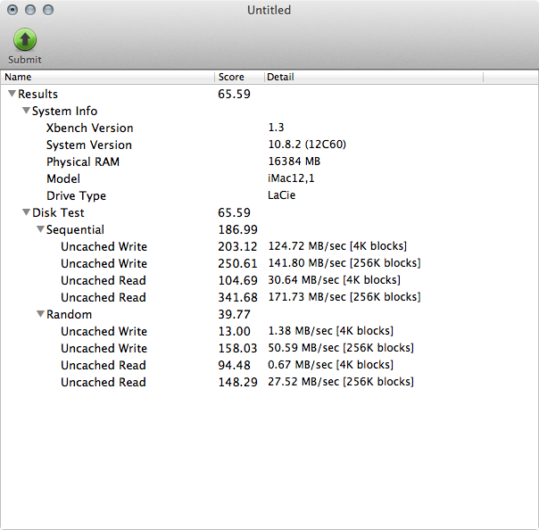 しいて言えば所有しているiMac Mid 2011のハードディスクはユーザー自身の交換は不可能らしいので内蔵ディスクが逝ってしまった時の起動ディスク用に・・・。XBenchでお約束のベンチマークを測ってみると、