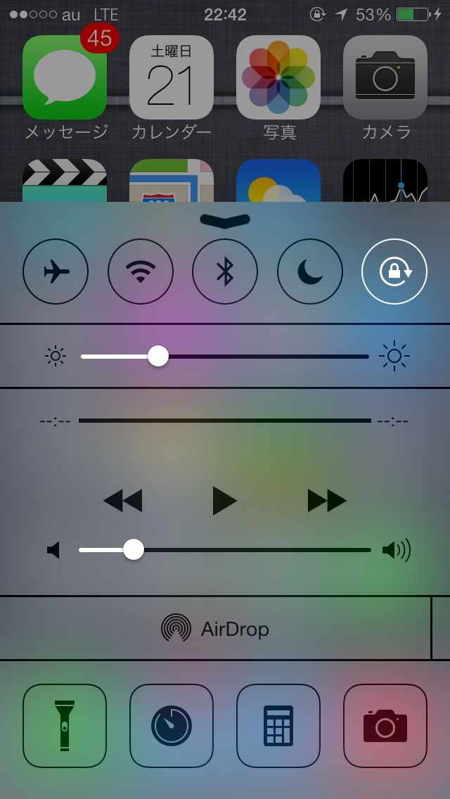 iOS 7のコントロールセンターではこれまで「ホームボタンの2度押し」>「最近使ったアプリの一覧を一番左へ移動」や「設定」から行っていた通信の各種設定を行うことができます。